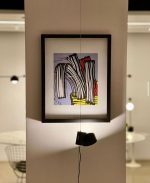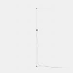 Luminária móvel para iluminação direcionada. Corpo em alumínio atirantado por cabo de aço entre piso e teto. Difusor em acrílico jateado e cabo elétrico para ligar em tomada.