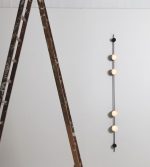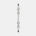 Luminária de parede para iluminação difusa. Corpo em aço e alumínio, com difusores esféricos em poliacetal. Refletores com acabamento padrão interno em branco. As peças em madeira podem apresentar variação de tonalidade.
