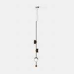 Luminária pendente de iluminação difusa. Corpo em aço e alumínio, com difusores esféricos em poliacetal. Canopla e demais acessórios na mesma cor de acabamento do produto e refletores com acabamento padrão interno em branco. As peças em madeira podem apresentar variação de tonalidade.