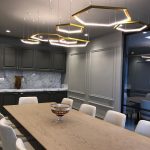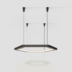 Luminária pendente com iluminação difusa para forros, suspensa por cabos elétricos. Estrutura em alumínio e difusor em acrílico jateado. Fonte 12VDC/25W bivolt remoto incluso.