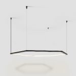 Luminária pendente com iluminação difusa para forros, suspensa por cabos elétricos. Estrutura em alumínio e difusor em acrílico jateado. Fonte 12VDC/25W bivolt remoto incluso.