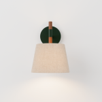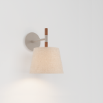 Arandela com detalhes da haste em madeira, peças em alumínio pintado, cobre ou latão, e cúpula em tecido de linho cru. proporciona iluminação difusa e agradável. utiliza lâmpada smart, que permite controle da intensidade de luz e temperatura de cor através do aplicativo lumini connect. possui botão liga/desliga na parte inferior da base.