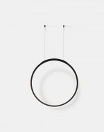Luminária pendente com iluminação difusa para forros, suspensa por cabos elétricos. Estrutura em alumínio e difusor em acrílico jateado. Fonte 12VDC/25W bivolt remoto incluso.