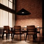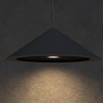 de luminárias pendentes e cônicas de amplas dimensões e proporções atípicas.