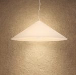 de luminárias pendentes e cônicas de amplas dimensões e proporções atípicas.