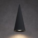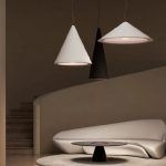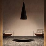 de luminárias pendentes e cônicas de amplas dimensões e proporções atípicas.