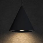 de luminárias pendentes e cônicas de amplas dimensões e proporções atípicas.