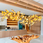 Criamos nossas peças utilizando os melhores materiais que o mercado tem a oferecer. Pendente sofisticado, mini folhas folheadas á mão que são fixadas na estrutura artesanal, criando leveza e sofisticação.