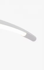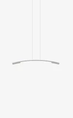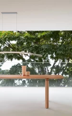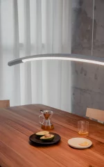 A Luminária Palo vem da vontade de criar uma fonte pendente, que pudesse dar conforto à mesa de jantar. A partir da horizontalidade da mesa, ela surge de um traço compatível e único, como uma pincelada suspensa. Algo leve e fluido, quase flutuante. A conexão com o teto se dá no centro da peça, o que faz com que as pontas caiam. Tal curva expressa uma maleabilidade vegetal, como se um bambu inspirasse a estrutura. Seu grande diferencial, que acaba por imprimir maior naturalidade à peça, é a textura. O metal é delicadamente rugoso, resultado de uma técnica de extrusão em que o calor e a ação alteram o alumínio.
