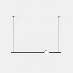 Corpos leves em alumínio acolhem o difusor de luz. Algumas das peças que fazem parte da coleção funcionam como módulos lineares e geométricos. A estrutura do pendente, por exemplo, permite disposições verticais e horizontais em diferentes alturas, criando combinações tridimensionais infinitas.