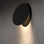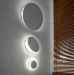 Luminária de parede em alumínio no formato de disco com iluminação difusa.