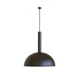 Luminária para iluminação difusa. Corpo em alumínio suspensa por cabo elétrico revestida de tecido preto. Canopla acompanha o acabamento do produto.